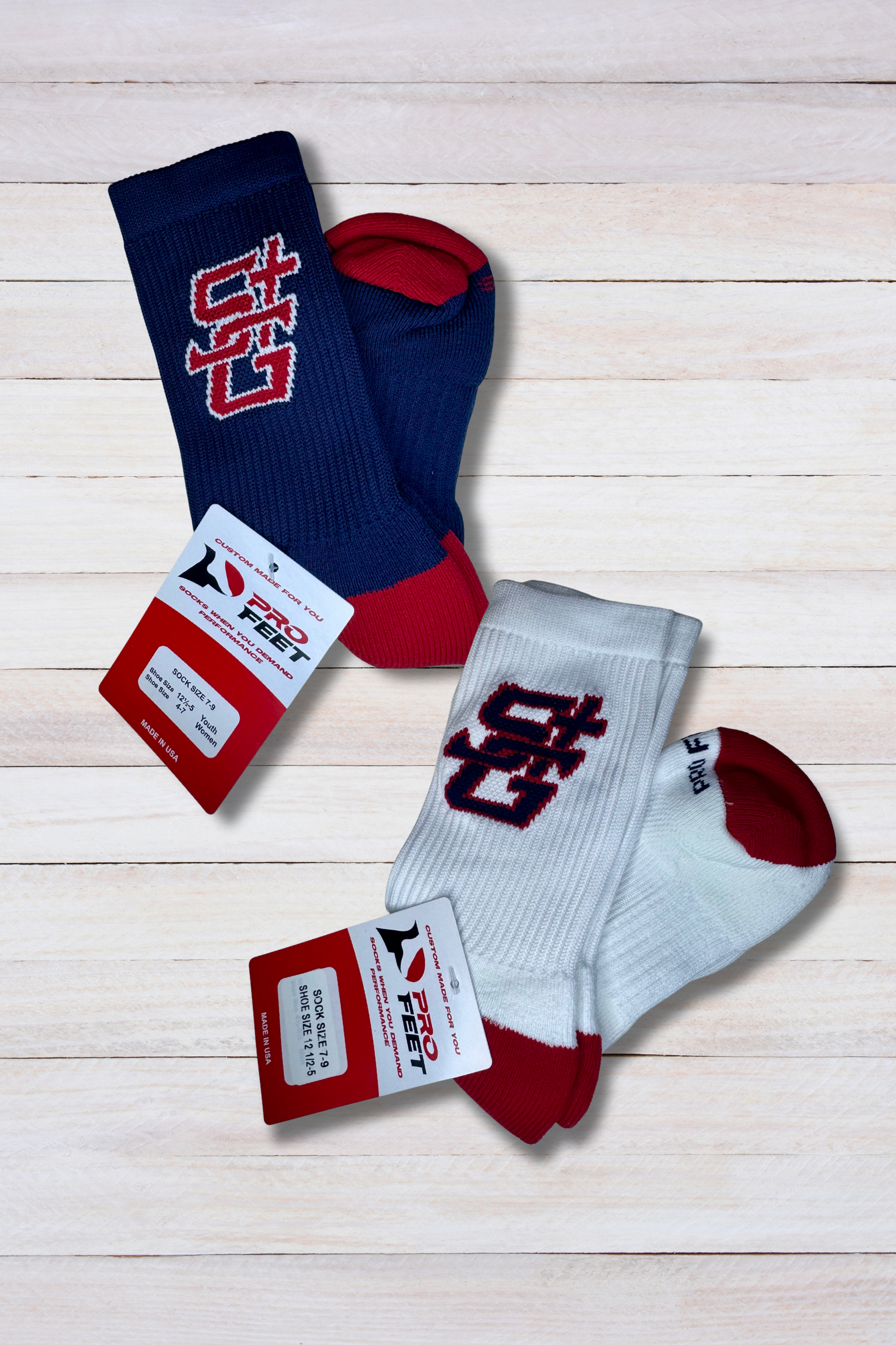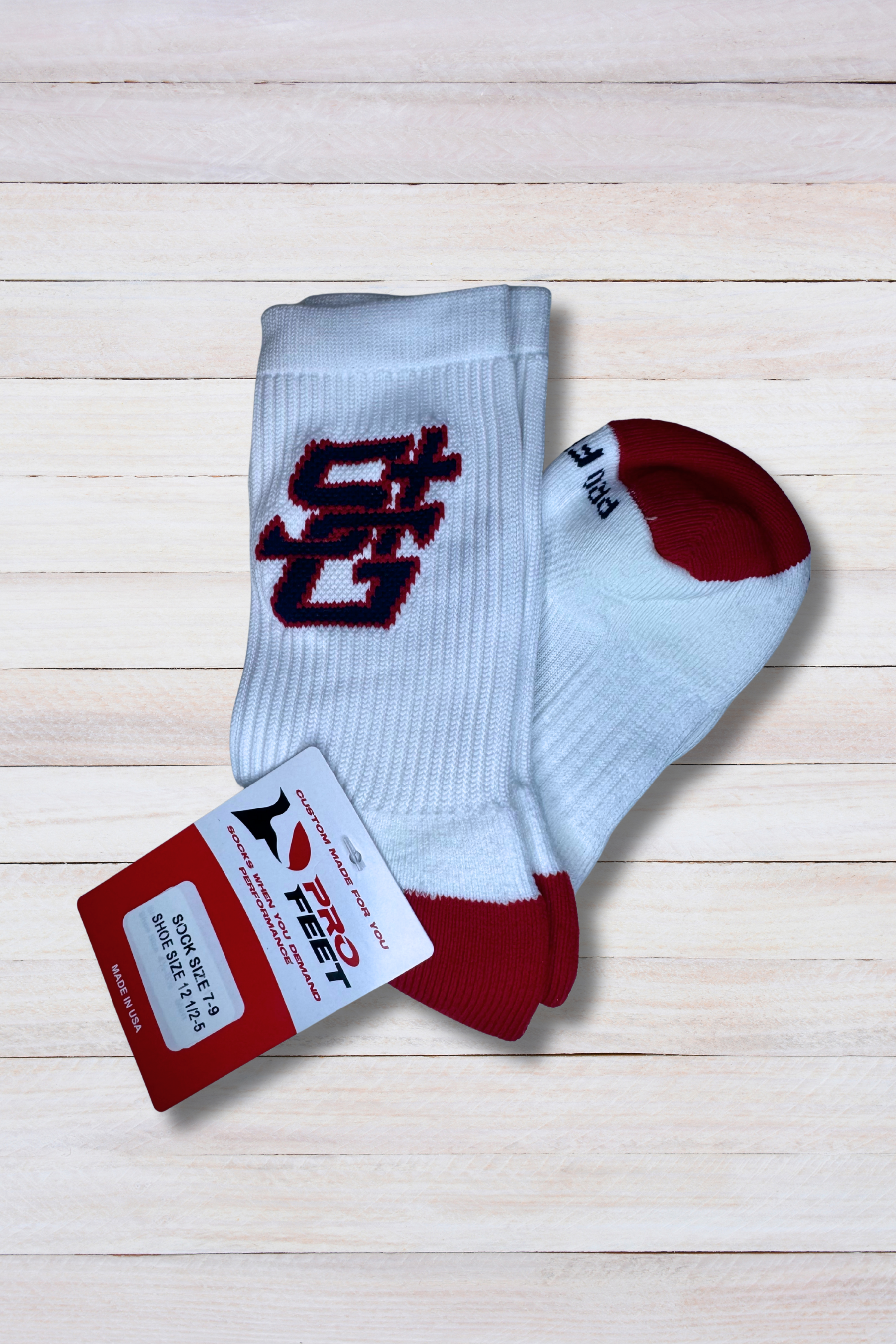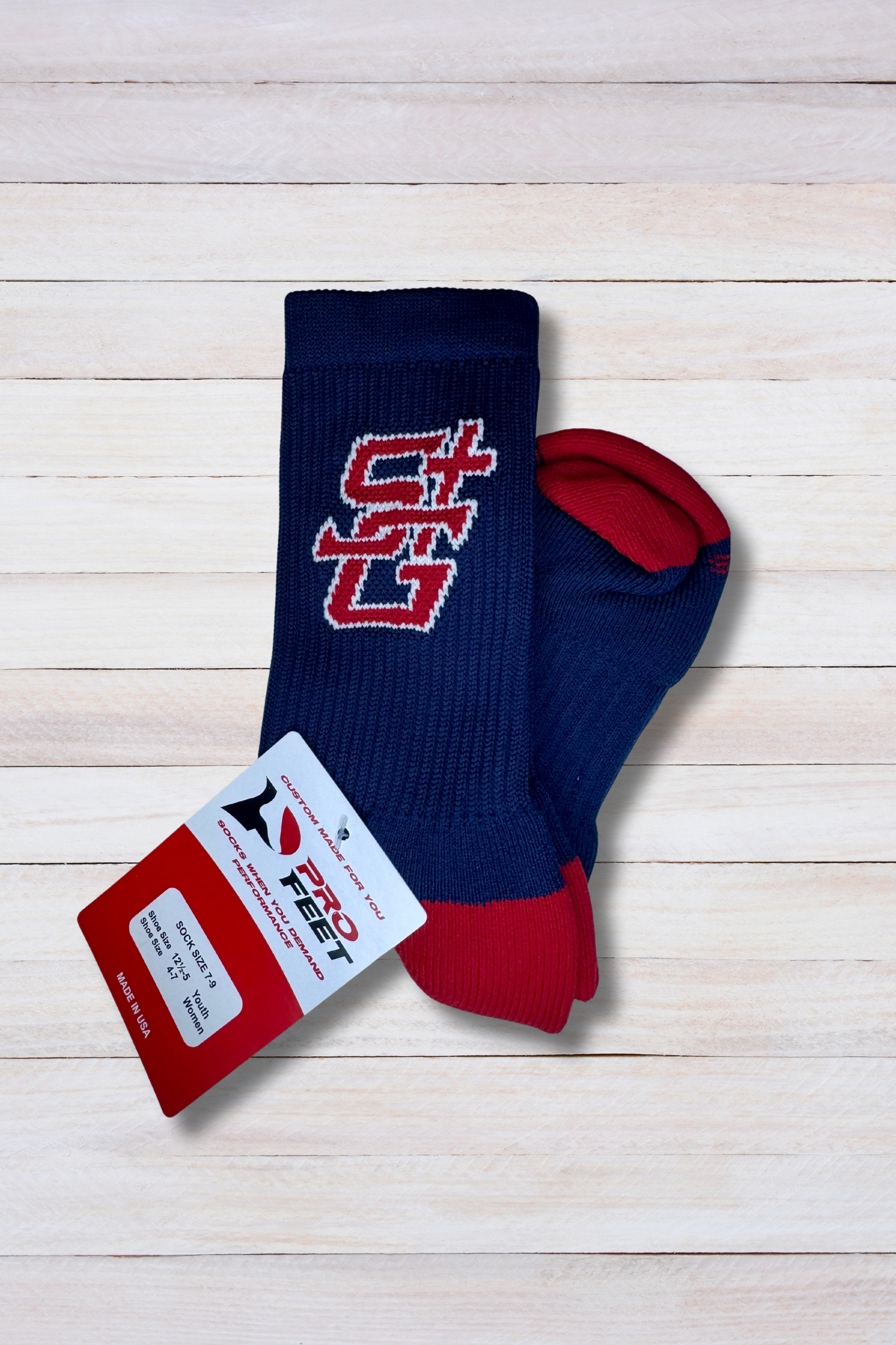 Pro Feet brand crew socks with St. Genevieve athletic logo
